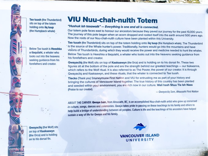 The totem poles are wonderful! Also nice to see the explanation of the figures. The only ones I have seen are in the Museum of Civilization in Ottawa. Also I didn’t know there was a Vancouver Island University.
