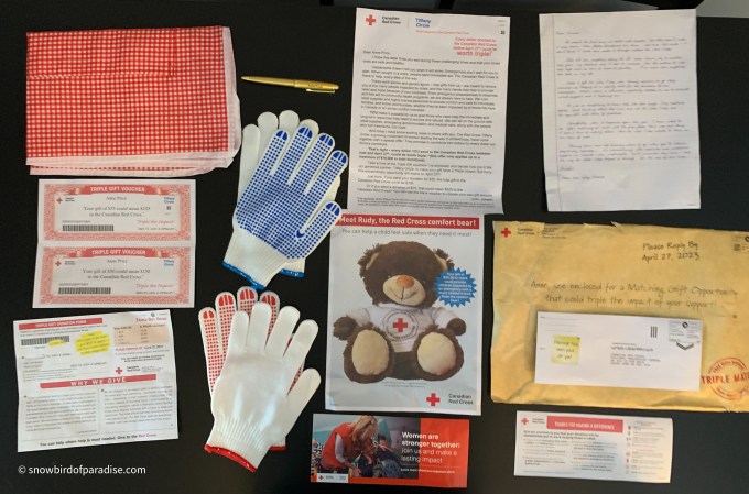 Yet again, despite repeated efforts to have my name taken off their mailing list, the Red Cross has sent me a package of things I don’t need and cannot use. The paper items can be recycled, and I will add the pen to the many I already have (after all, no-one else wants a pen with my name on it), but I don’t know what to do with the apron or what they describe as work gloves.