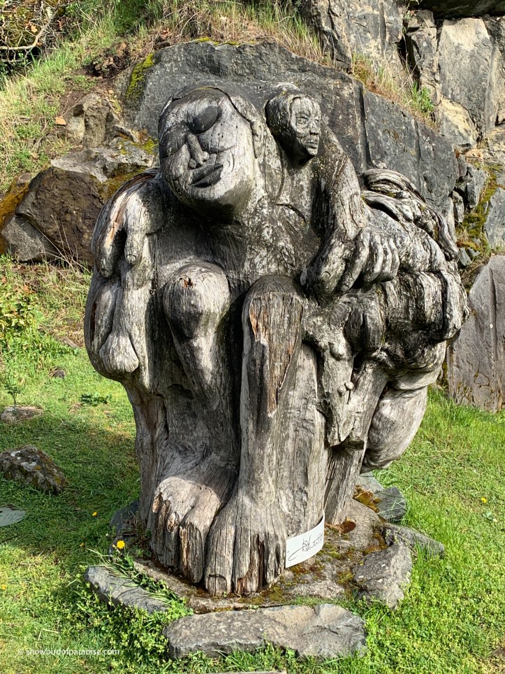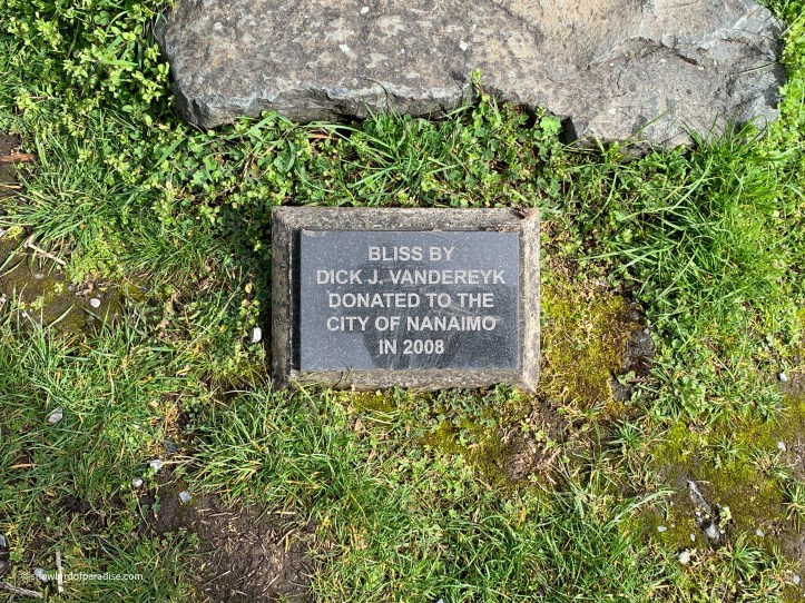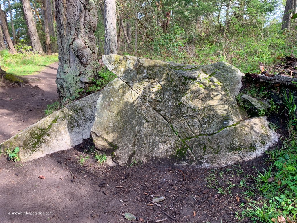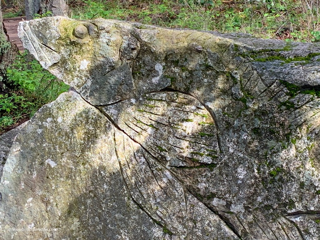 It was exciting to first hear and then see bald eagles patrolling the skies above our heads. We also saw a variety of ducks, Canada Geese, and a blue heron. In addition, beside the trail is a fabulous wood carving entitled “Bliss” by Dick J. Vandereyk.