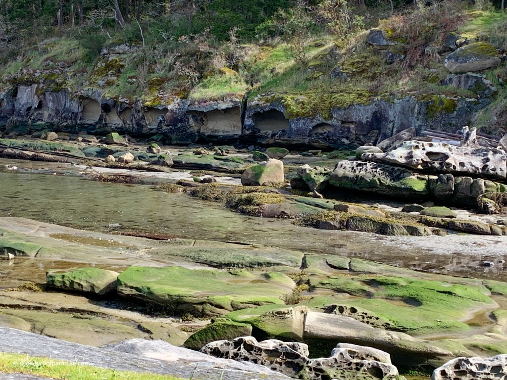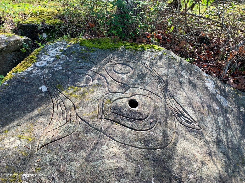 The rock formations are smooth almost-flat rocks throughout the park and, in contrast, at the water’s edge the waves have created large caves. Some of the rocks have been enhanced by gorgeous carvings of unknown age and origin.
