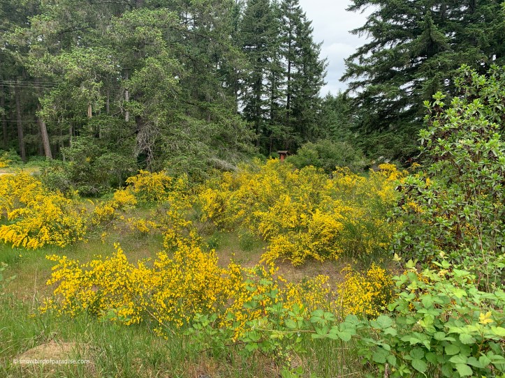 The yellow broom you can see in these photos is not native to the area. It was introduced, according to legend, by a Scottish person who thought Vancouver Island needed some yellow flowers. It has since become an an invasive species and thwarts all attempts to remove it.