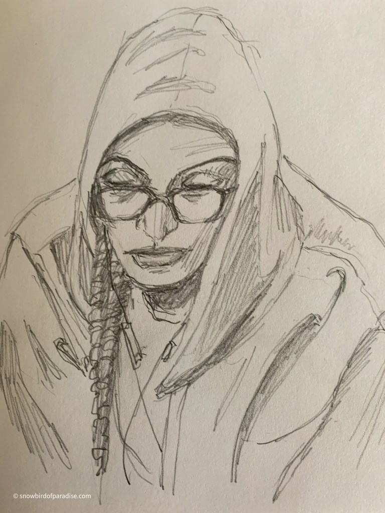Some family members, though, never stopped encouraging me to keep on drawing and painting. My daughter-in-law, Julie, invited me to go to, and joined me in, some painting classes a few years back, and that lit a new spark. More recently Jamie, my younger child, and I started to exchange a sketch book every few weeks. We both draw or paint something random and then send it back. We don’t comment, we just create.