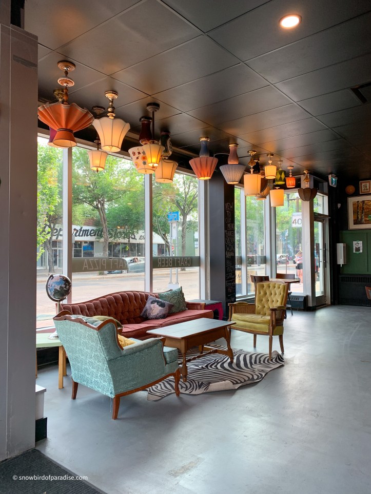 First, I was pleasantly surprised at the decor. It looks as though the owners have designed the interior around thrift store finds, and it works! The ceiling displays a large collection of table lamps, all a little bit dated in style, and all upside down.