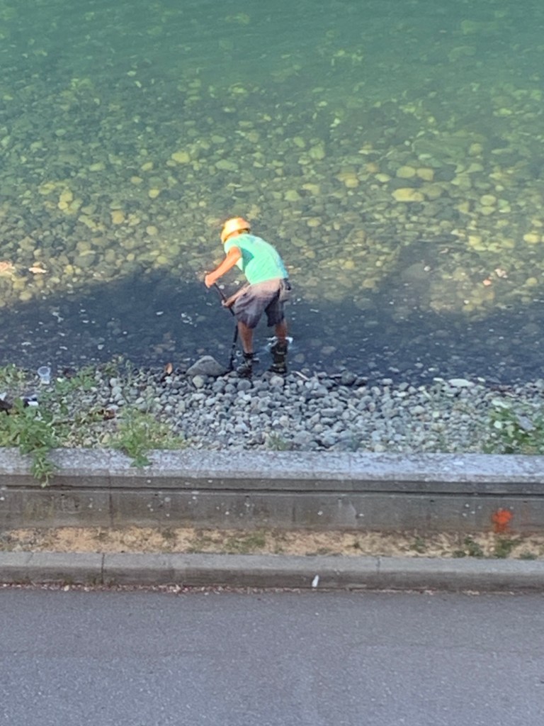 I wondered about the man and his circumstances. He appeared well-dressed, with a jaunty hat and clean clothes, so he didn’t seem to be unhoused or un-cared-for. But he continued to poke about under the rocks, digging up little muddy plumes under the water.
