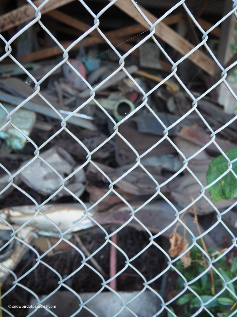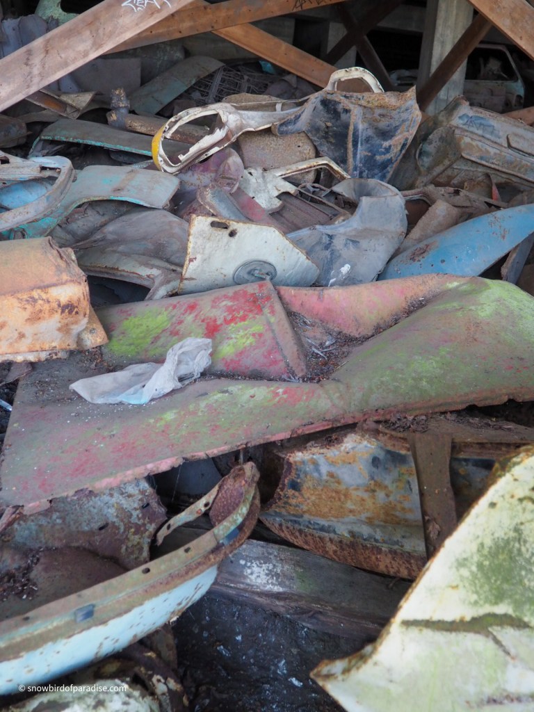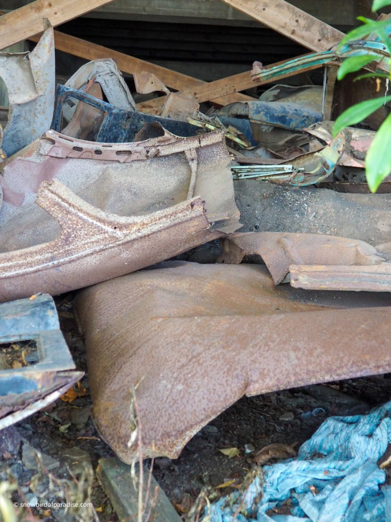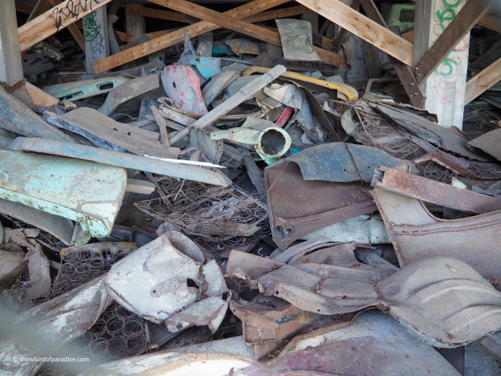 As I approached the building to take photos, I realized that behind the chainlink fence that is across the foundation there was an enormous collection of scrap metal car parts. They must have been there for decades.