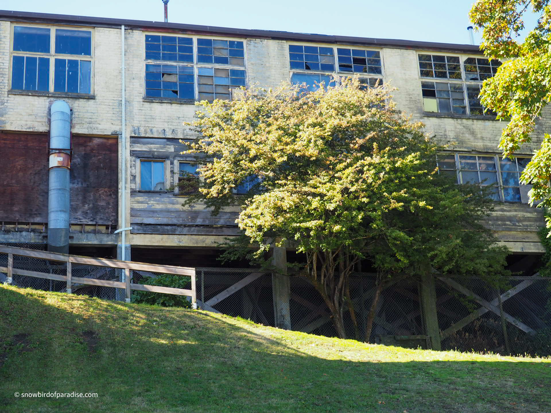 When seen from the harbour front walkway, the back of the building shows its neglect.