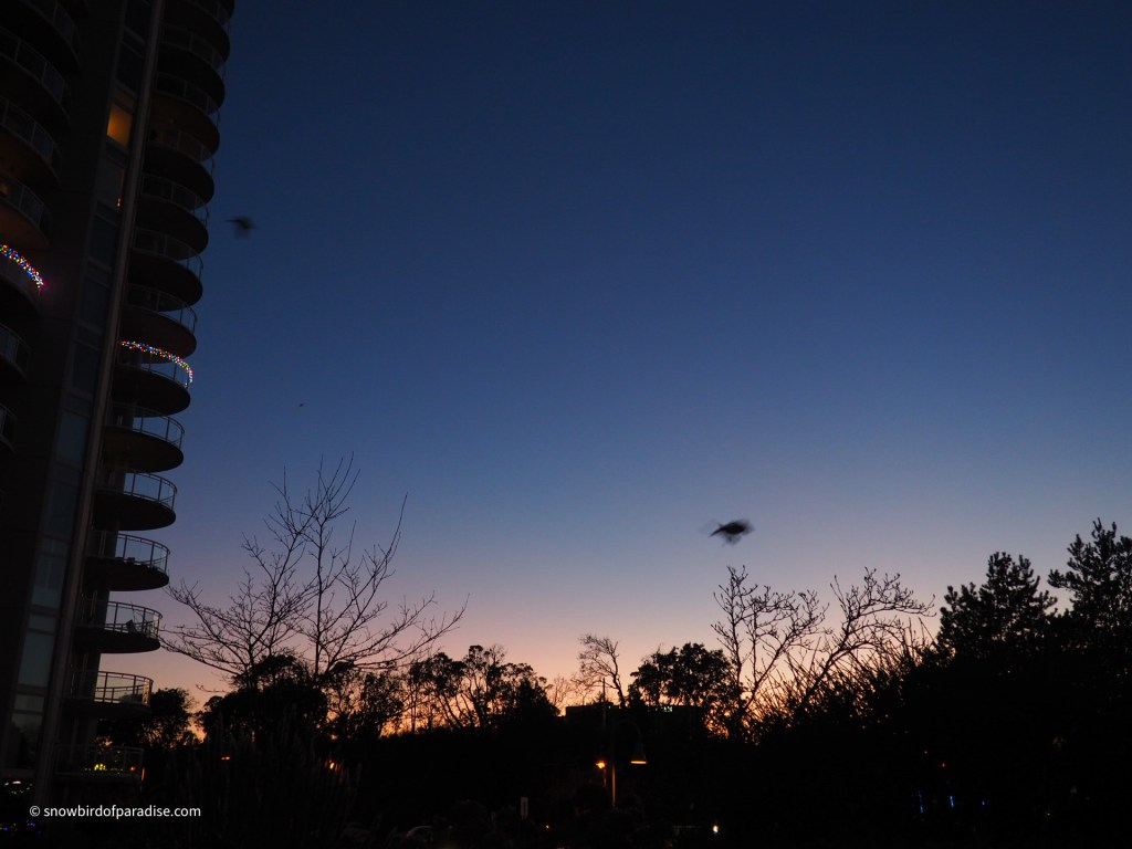 A few days ago I went out to try to capture the lovely purple evening sky when, at the same time, a flock of Mergansers chose that moment to fly by.