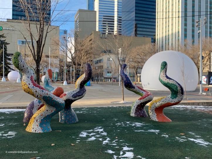 Today is bright and crisp in Edmonton, and I thought Churchill Square might be a good place to visit on my first day back in a long while. It didn’t have the food trucks and patio chairs I had anticipated, but it did have some interesting Christmas decorations.