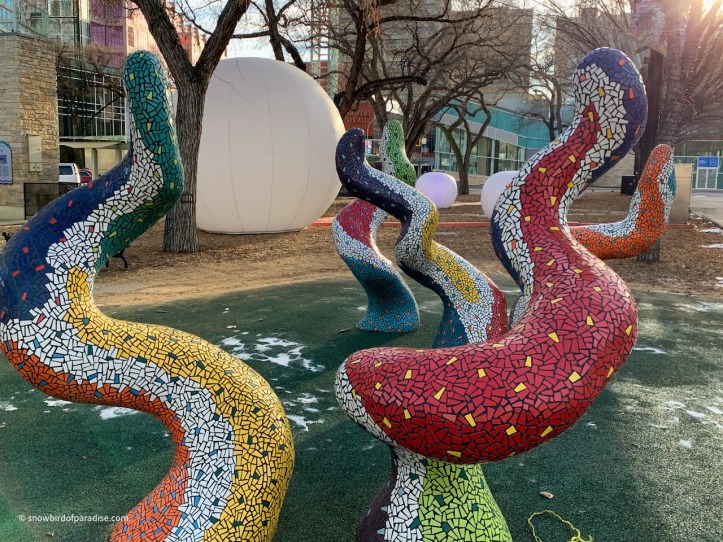 I could not find the name of the artist for the sculpture in the following pictures, but if and when I do, I will post it here. The colourful protrusions are a lot of fun, and they too would probably look even better if there were snow on the ground.