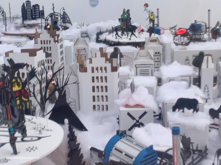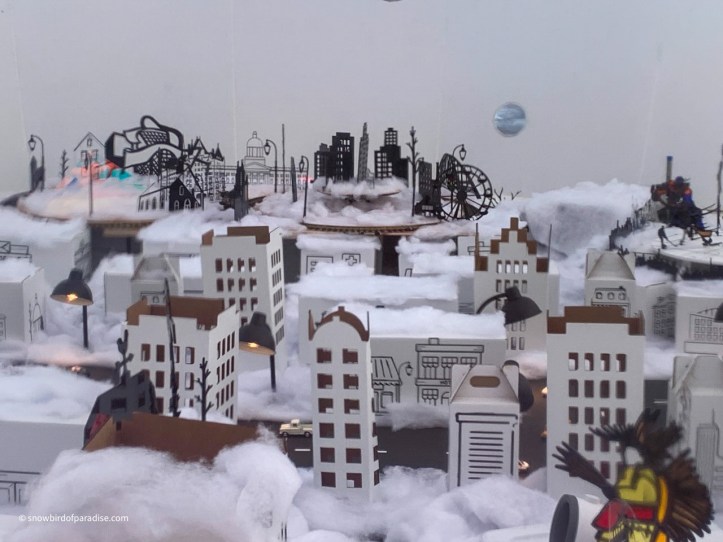 The artist probably anticipated snow on the ground when they devised these giant snowballs, but sadly the lighting cable coverings are still very apparent. Thanks to some curious visitors who showed them to me, I discovered windows in one of the snowballs and when I looked inside I saw a very elaborate train set.