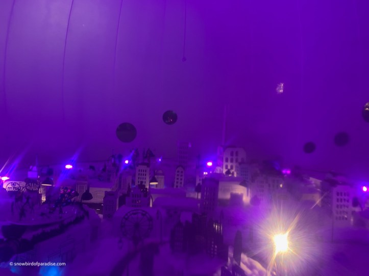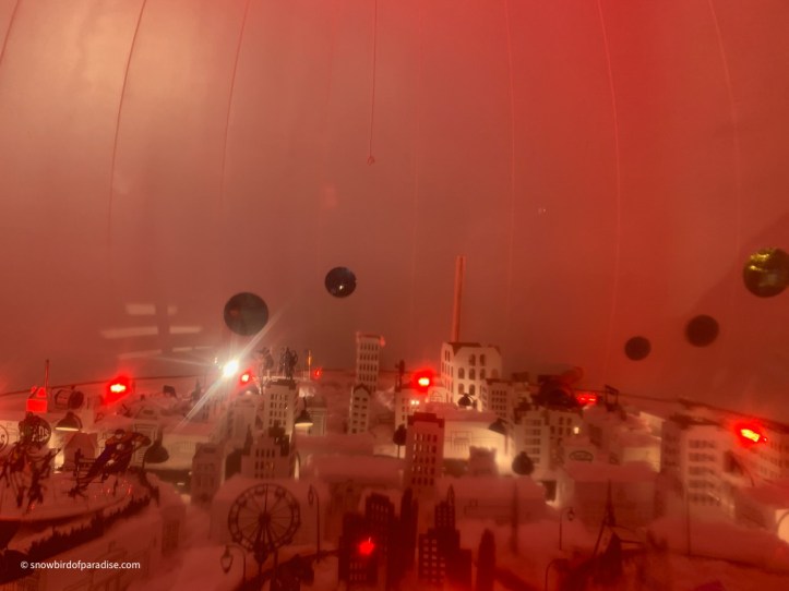 It surprised me to realize that as the model railway train in the biggest dome circles the track its light casts shadows of the buildings and characters in the tableau onto the walls of the dome.β