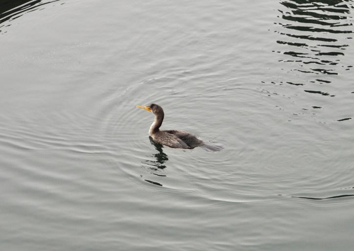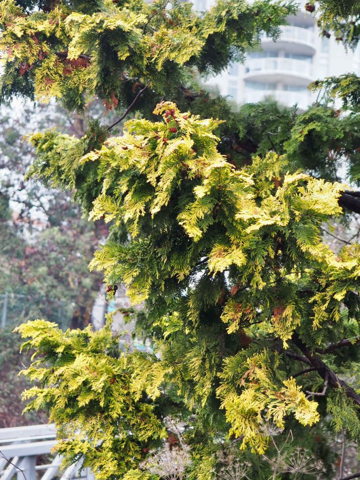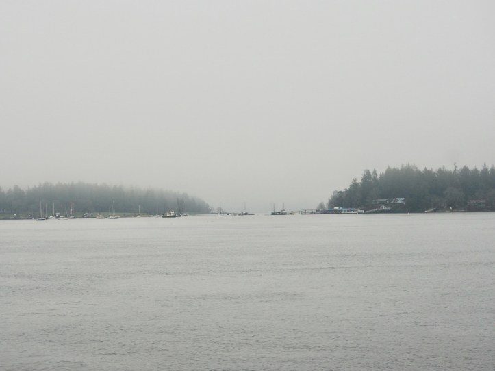 The fog was beginning to lift when I went for a walk this morning, but the seaplanes were not flying today. I watched a Cormorant and a Merganser diving for food, and I found a Cypress tree (I think) that had frosted tips on one side.