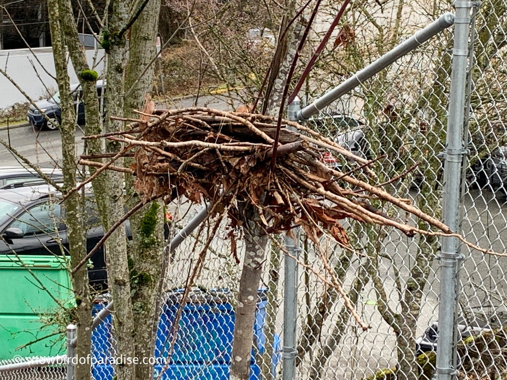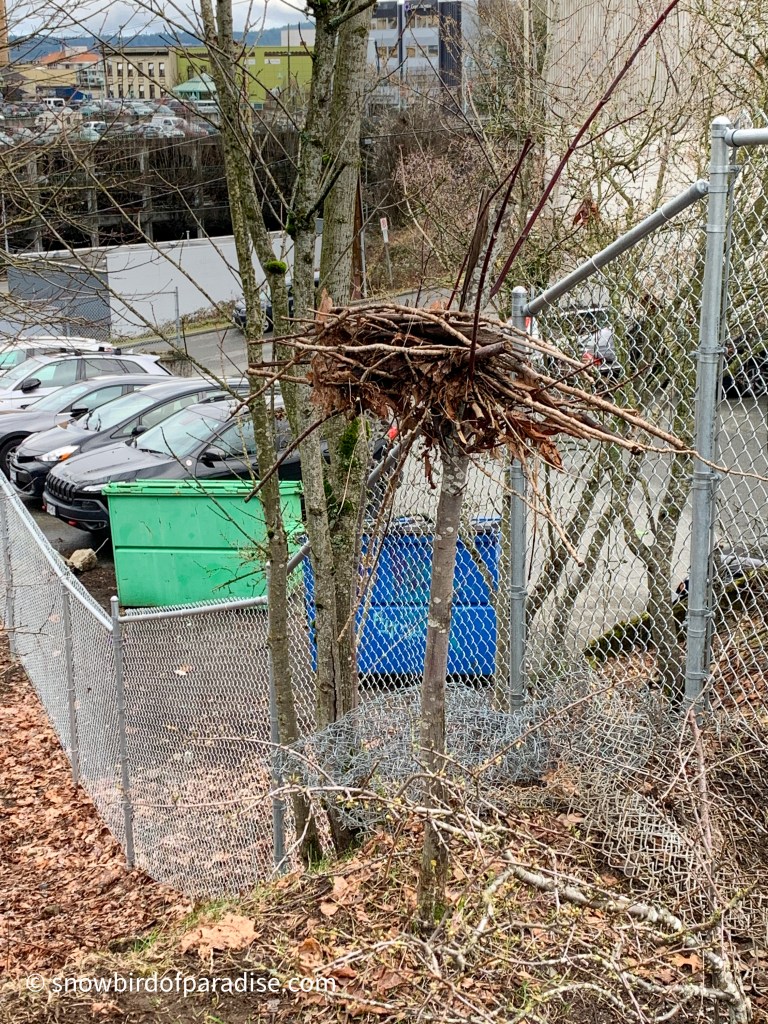 When I was out walking the other day I saw this collection of twigs in the slender branches of a small tree. I couldn’t figure out if a very large bird had put them there or a human. Either way, it doesn’t make sense. The tree branches are too small to support a large nest and the tree is not tall enough to provide a safe place for a large bird. Also, the twigs are probably too big even for an eagle to carry.