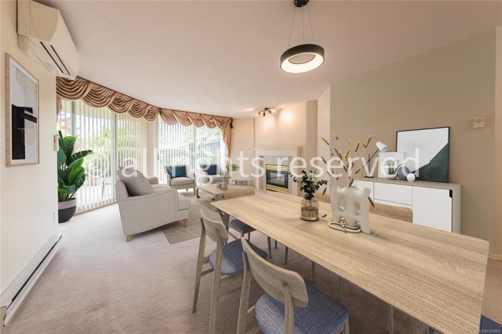 Here is the living room and dining area. A large table would fit in this space only if there were no chairs on the right of the fireplace.