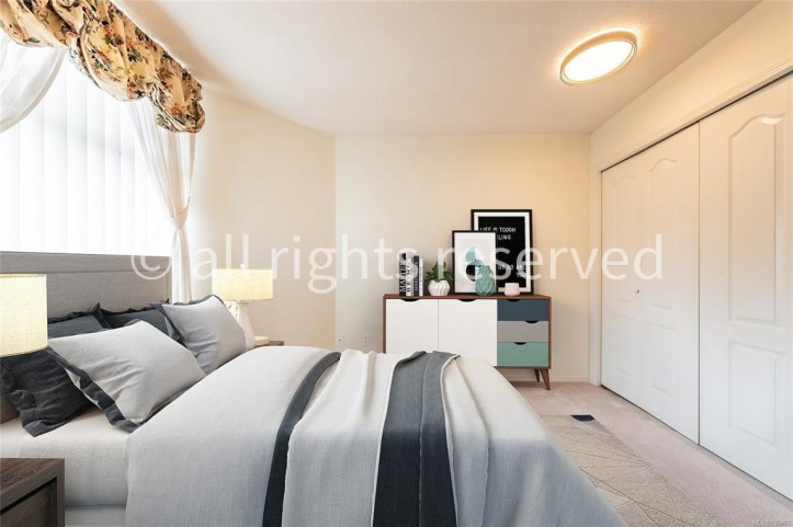The second bedroom shows an even greater contrast between the realtor’s image and my own. In fact, what they have virtually staged could not be staged in real life. The window wall is not wide enough for anything larger than a twin bed. It is also where the baseboard heater is placed, so putting a bed there would block the only source of heat in the room. The walls on either side of the window are at an angle, making the placement of bedside tables awkward.