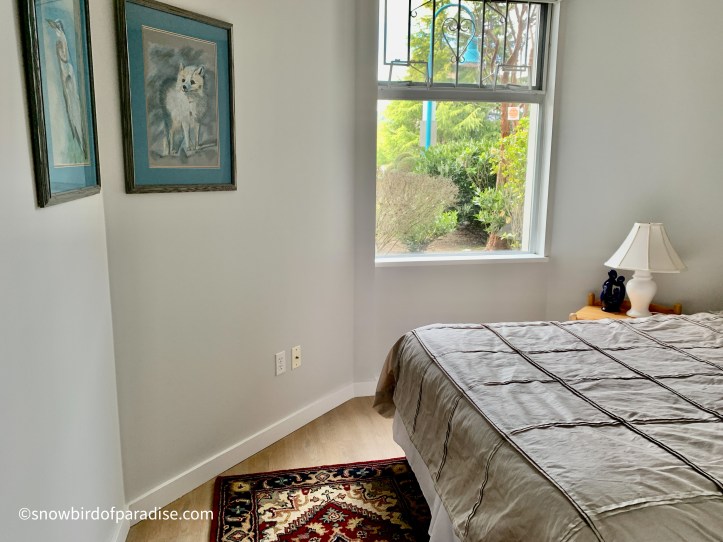 The realtor’s picture of the main bedroom shows a greatly exaggerated situation. The bed in their virtual staging can be only about 3 ft long. My bed, by comparison, is queen size. The space beside the window, though, is larger than the realtor’s image suggests; it provides enough room for my painting table and easel.