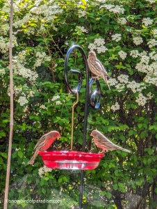 Female finch 1: Thank you for the thought, hon, but the system is designed for hummingbirds. We should just leave it for them.