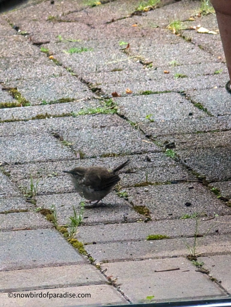 This morning I watched as a Bewick’s Wren fed one of her fledglings. They were right in front of my patio door and I was amazed at how tiny the fledglings were. Three of them were nestled under one of my plant pots and they were all smaller than the plant stand’s wheels.