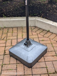 While I was there I selected a round, fillable, umbrella base from among a choice of about five. It was the smallest one available and the least expensive, but I checked with the cashier and she thought it would do the trick.
