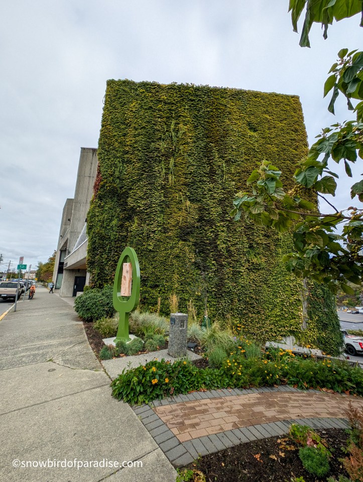 There is a five-way intersection in Nanaimo where Bastion Street, Fitzwilliam Street, Fraser Street and Wallace Street all meet. That convergence has created an odd little triangle of land that the city has turned into a pocket park with a bench and flowers. The building beside the park has a wall that has been turned into an amazing, huge, vertical garden.