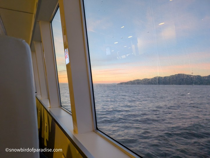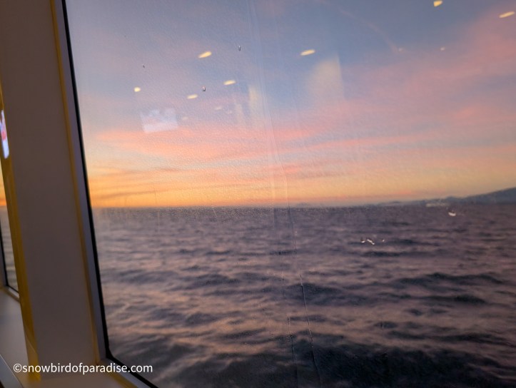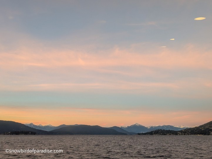 The first picture is of the sunrise at the ferry dock in Nanaimo. The following pictures are of the return journey and sunset, taken through the window of the ferry. (The reflections of light are not aliens. .. as far as I know.) I just wanted to record the colours in hopes of someday painting them.