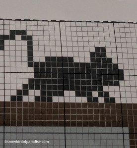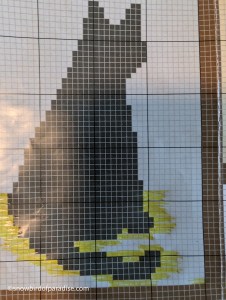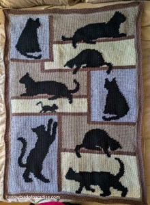 In order to follow the pattern, I learned to read the front of the afghan from right to left and the back from left to right. At first, that was mind-boggling, but I eventually got it. Instead of counting every stitch for every row, I used a yellow highlighter to identify the stitches I had completed adjacent to the stitches for the cats. That way, I only needed to count the stitches in and around those images. As backup, I also kept a row count.