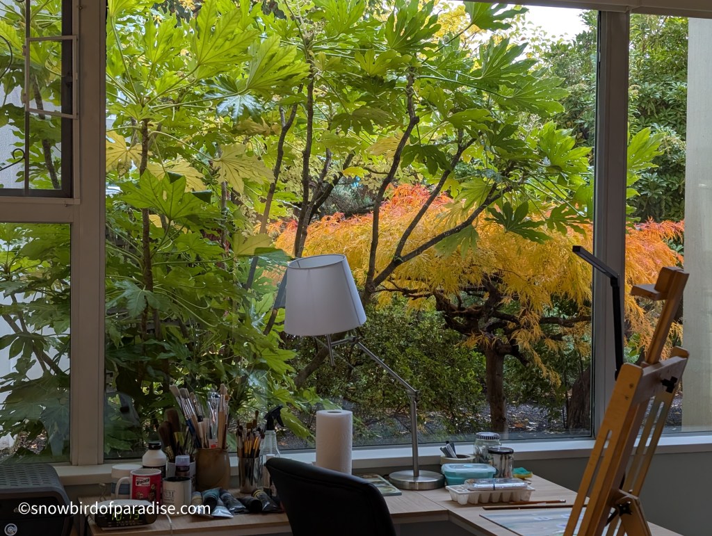 This is the view through the window beside my painting area today. Some of nature’s colours are too good to try to reproduce.