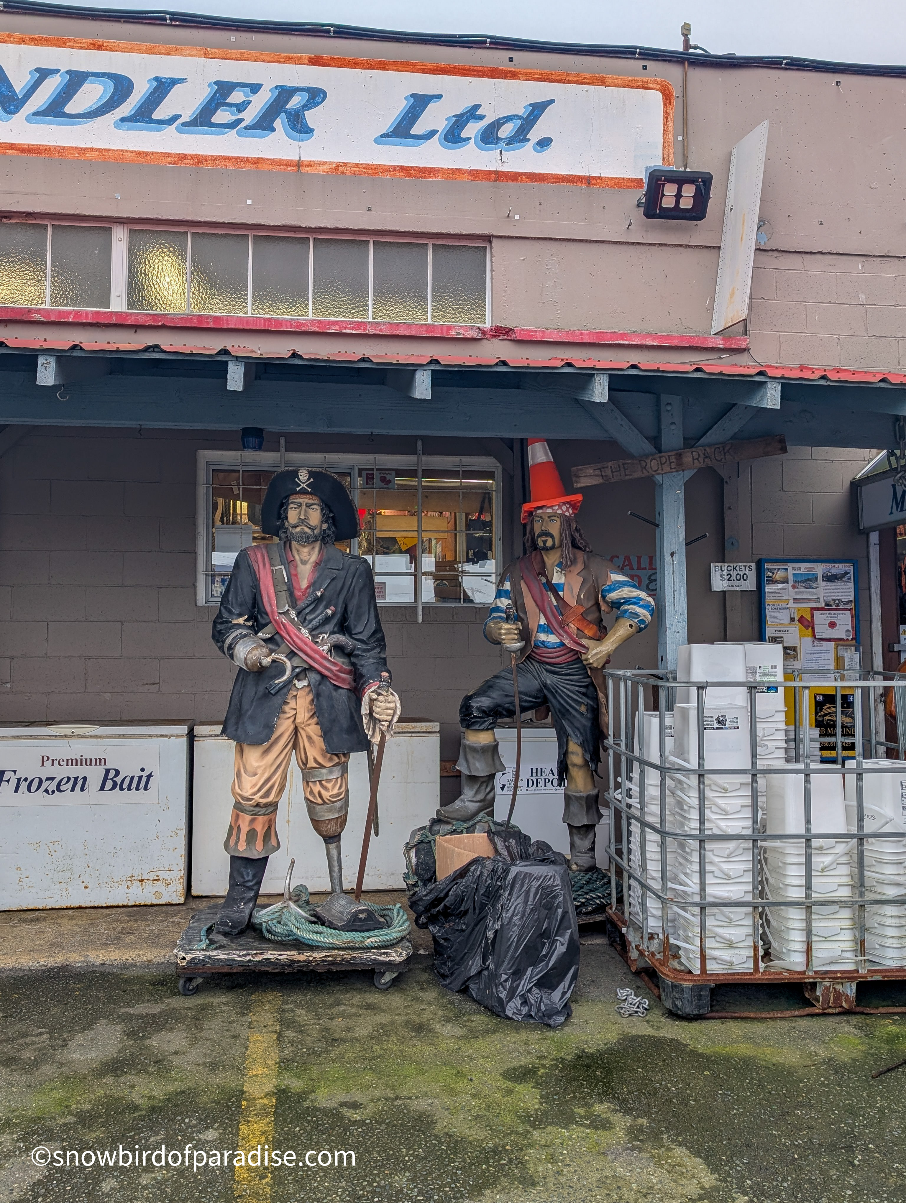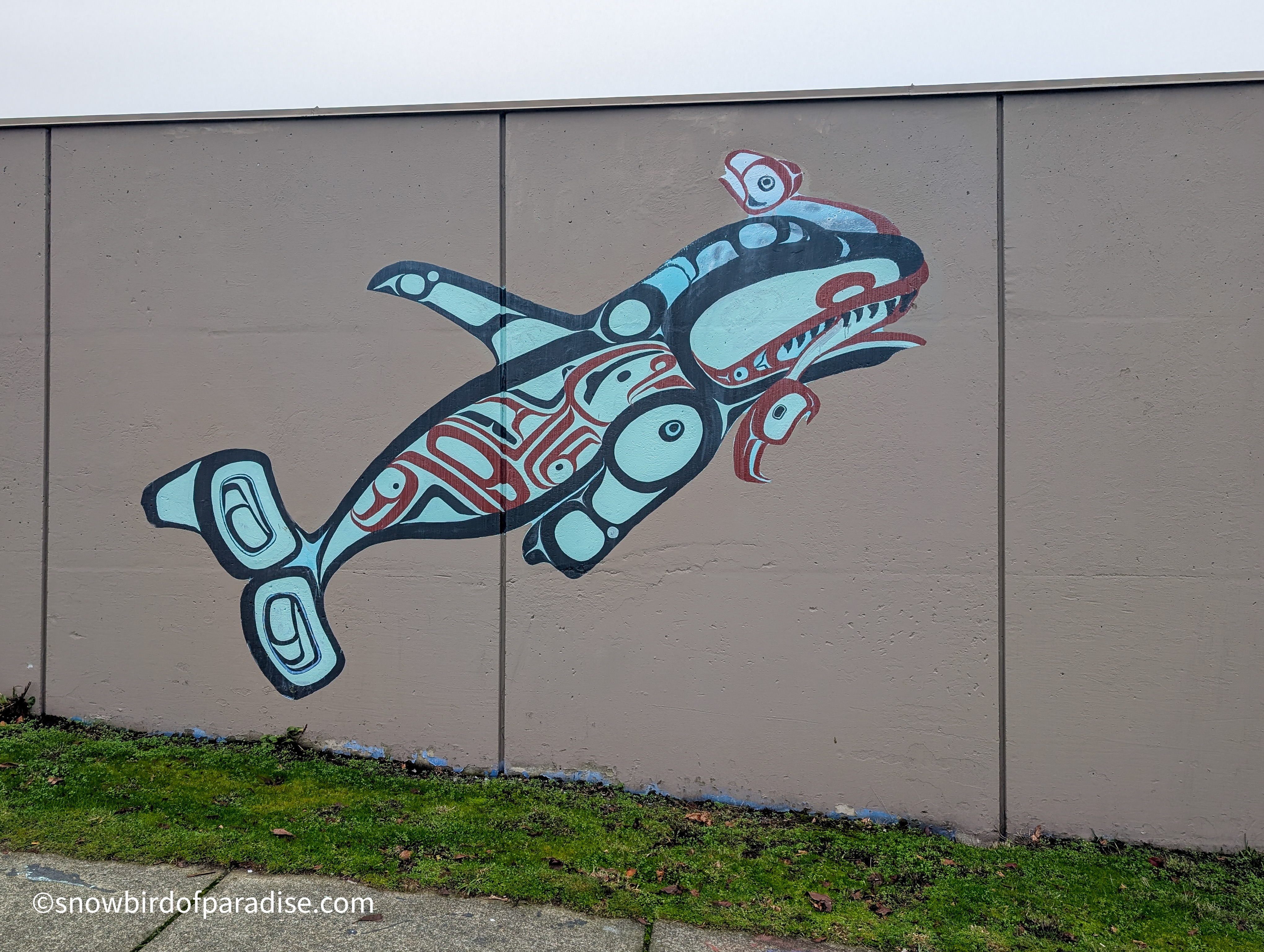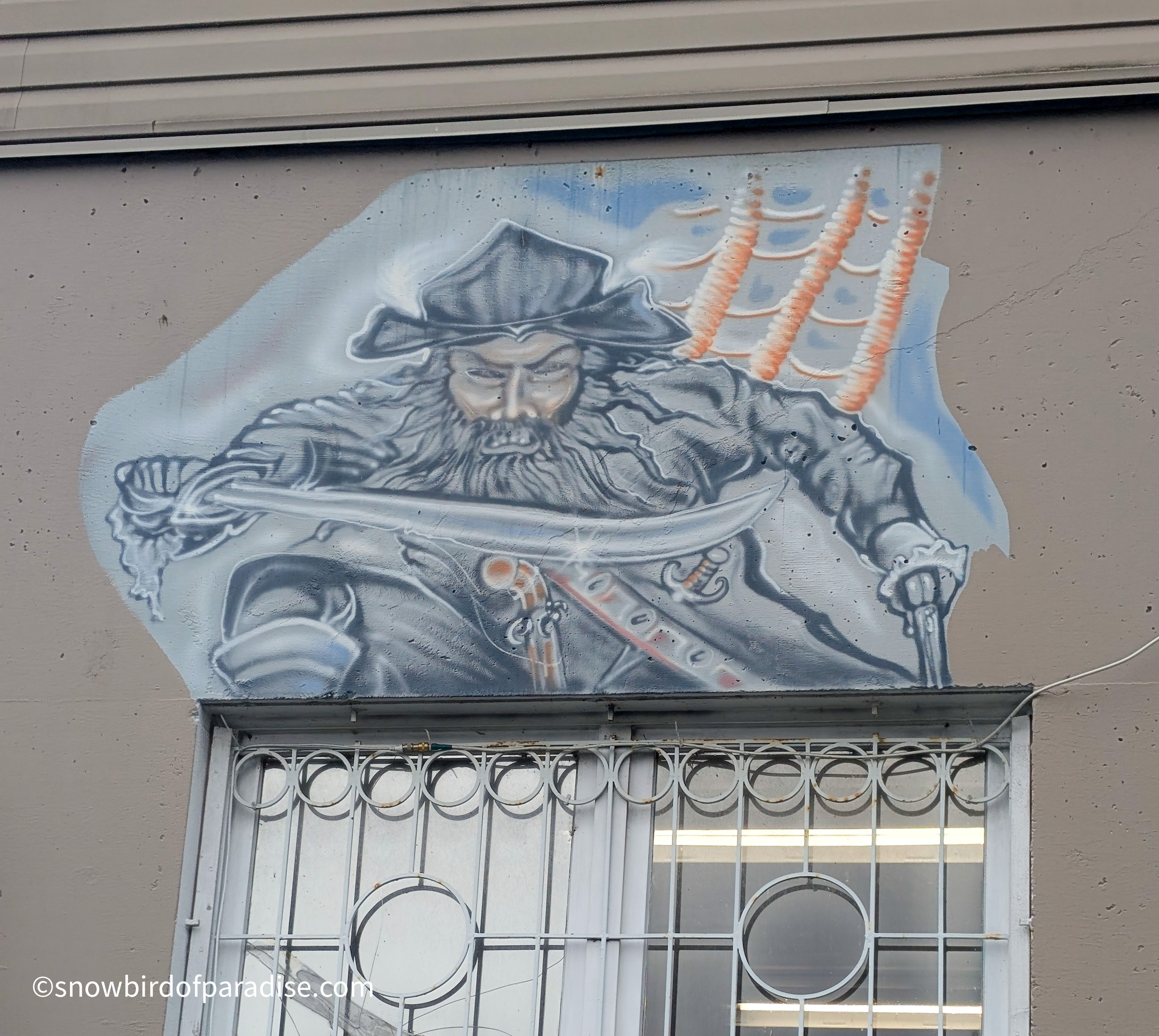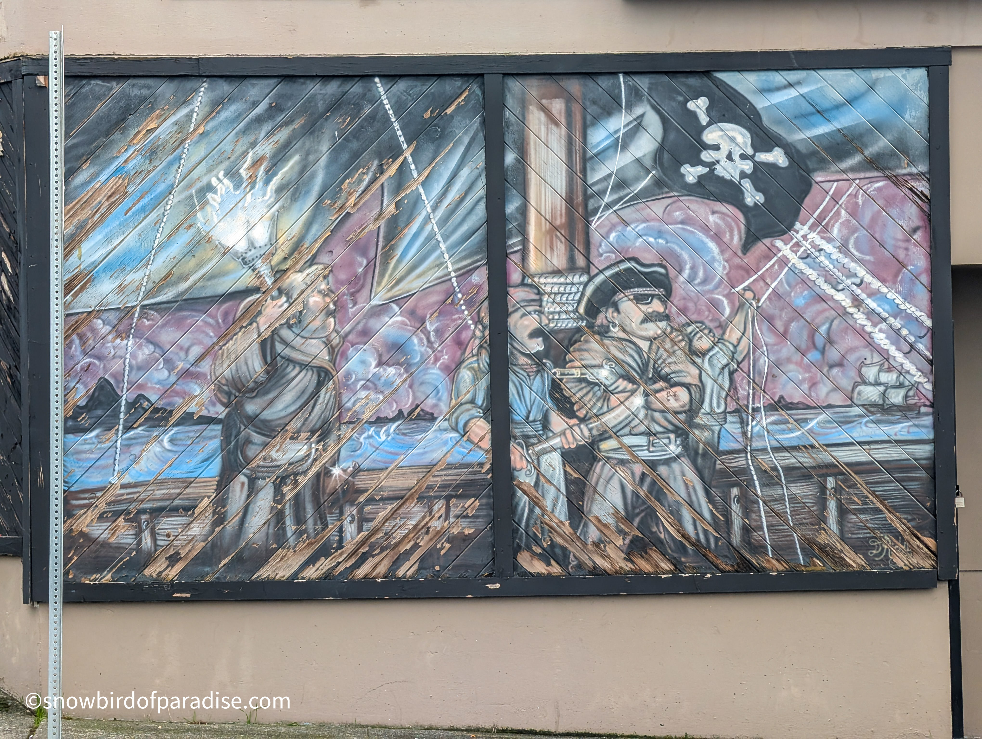 Outside the Harbour Chandler store in Nanaimo are several murals and a few sculptures that all reflect a nautical theme and are a lot of fun. The images of pirates are now a little faded but still impressive in their artistry, and I got a chuckle when I was surprised by seeing one of the pirates in a boat. In addition to the pirate theme there is one mural of an Orca which appears to have been created by an indigenous artist.
